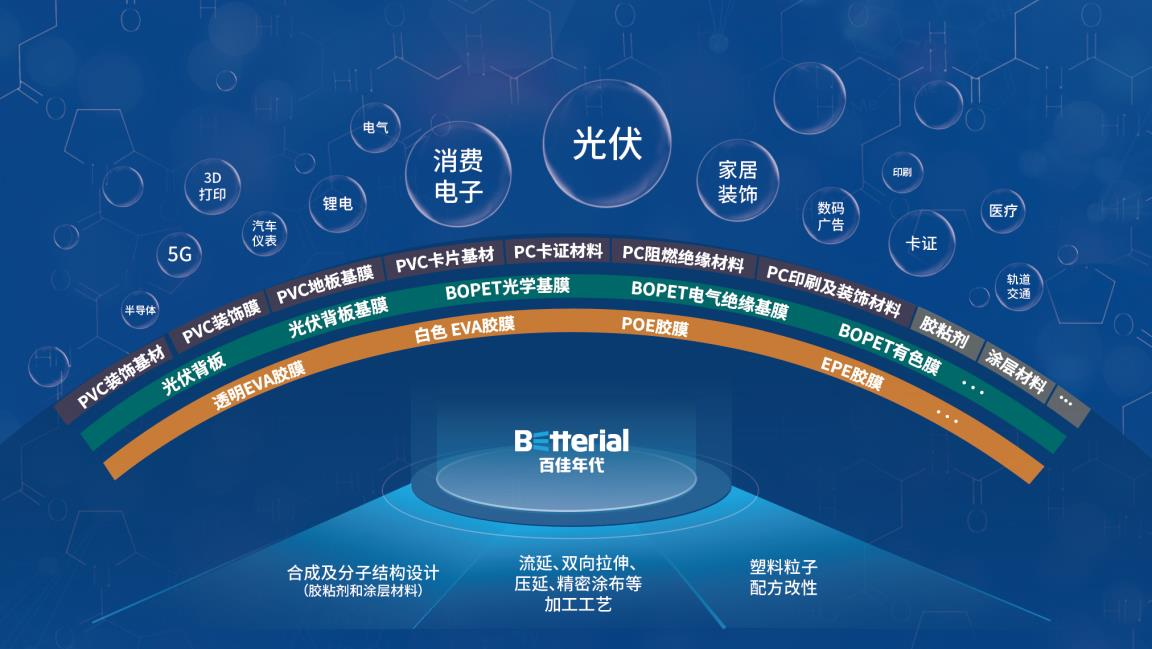 百佳年代成立于2007年,注册资本18669.9247万元,总部位于江苏常州。是一家专注于功能薄膜材料研发、生产、销售和服务的国家高新技术企业,是国内领先的功能性薄膜生产企业之一,公司设有常州、盐城、滁州、咸阳、越南、印尼、土耳其七大生产基地。主营产品为光伏封装胶膜、光伏背板、BOPET膜、PVC膜、PC膜及涂层材料等特种功能性高分子薄膜材料。2020年被工信部认定为第二批专精特新“小巨人”企业,被江苏省科技厅认定为“江苏省柔性显示与照明新材料工程技术研究中心”。