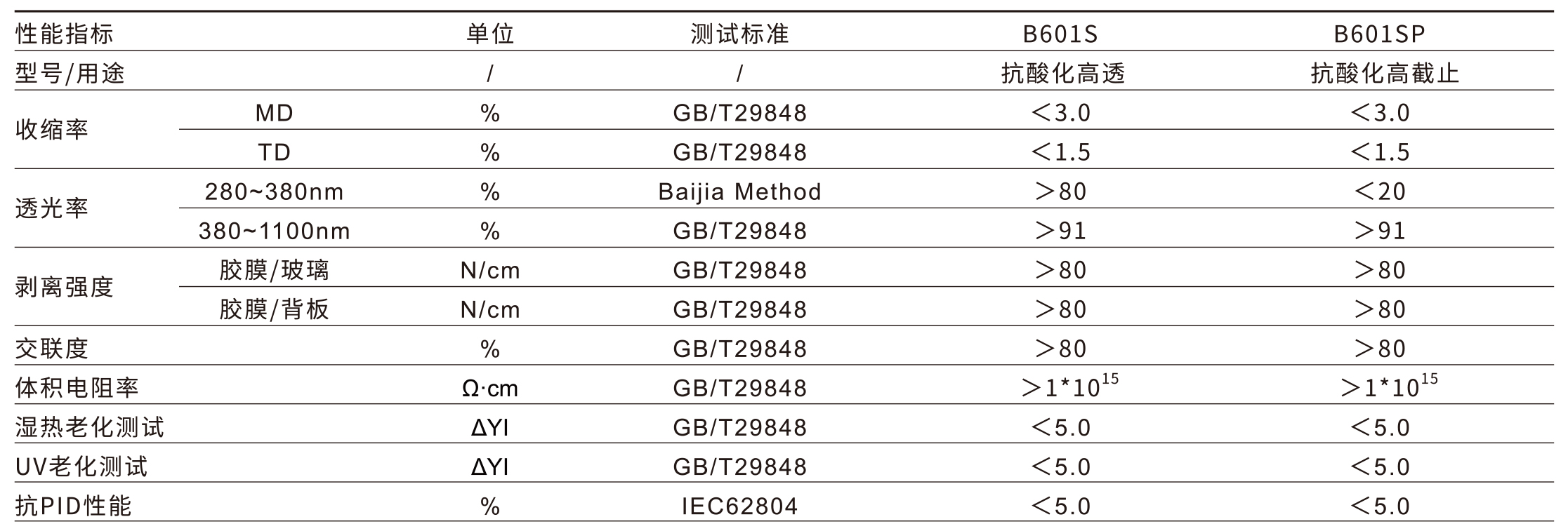 B601S抗酸化高透EVA胶膜,采用百佳年代的交联及吸附控制技术,有效抑制胶膜中游离醋酸的产生,显著降低电池和组件的劣化。同时,该胶膜采用了百佳年代专利技术(中国发明专利ZL202110291956.1),可有效抑制EVA的水解,具备出色的抗湿热性能。在高热、高湿、严寒等环境下,B601S可为组件提供更多的可靠保障。
