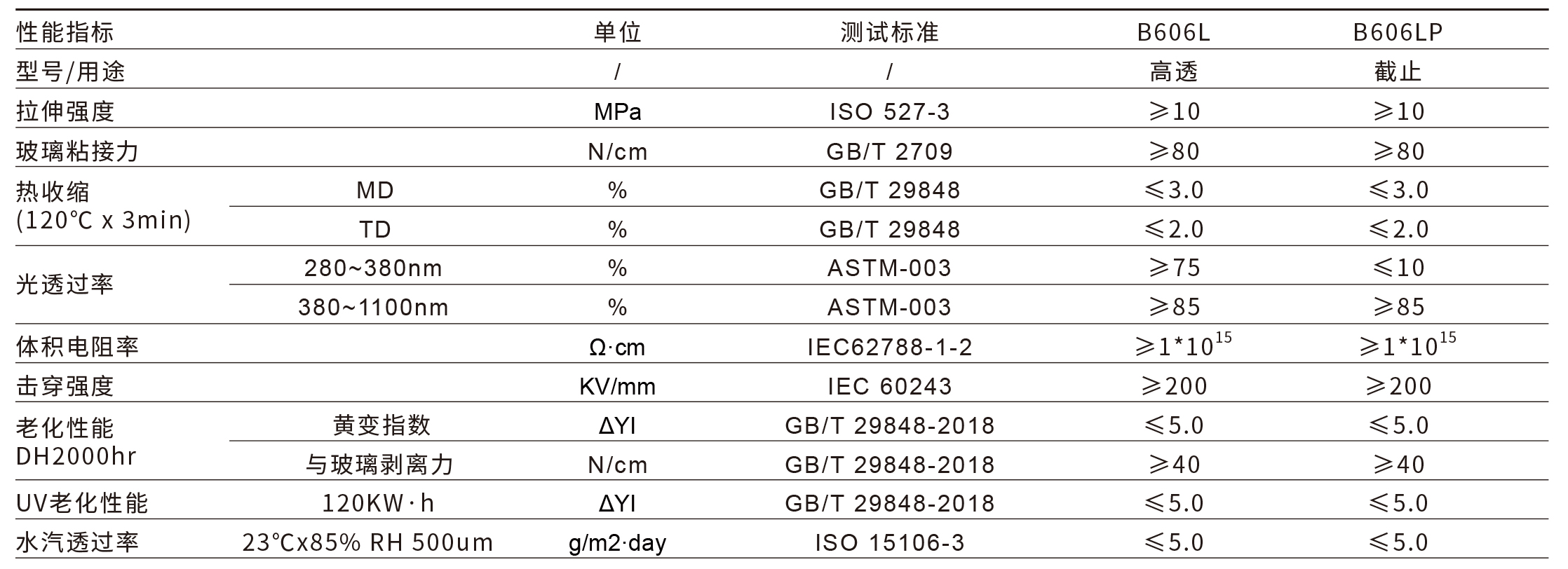 非交联型、层压温度低时间短、高耐候性、低水汽透过率、高透过率、老化剥离力衰减低、无小分子物质释放。