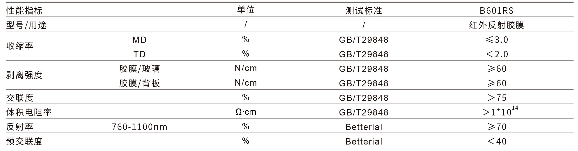高反射率、无溢白无褶皱、高增益、抗PID、老化后颜色稳定;与电池片色差小,具有美观的组件外观。