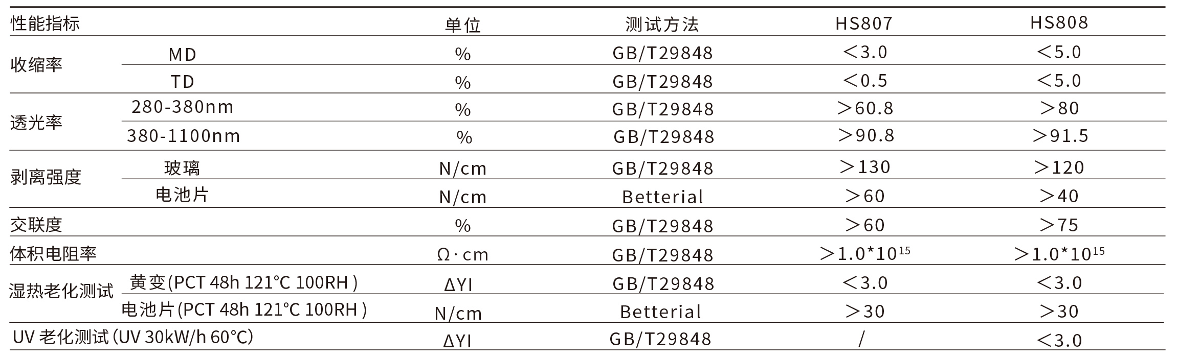 高透光率;老化剥离力衰减低;焊带电池一步封装;低腐蚀、双面抗PID。