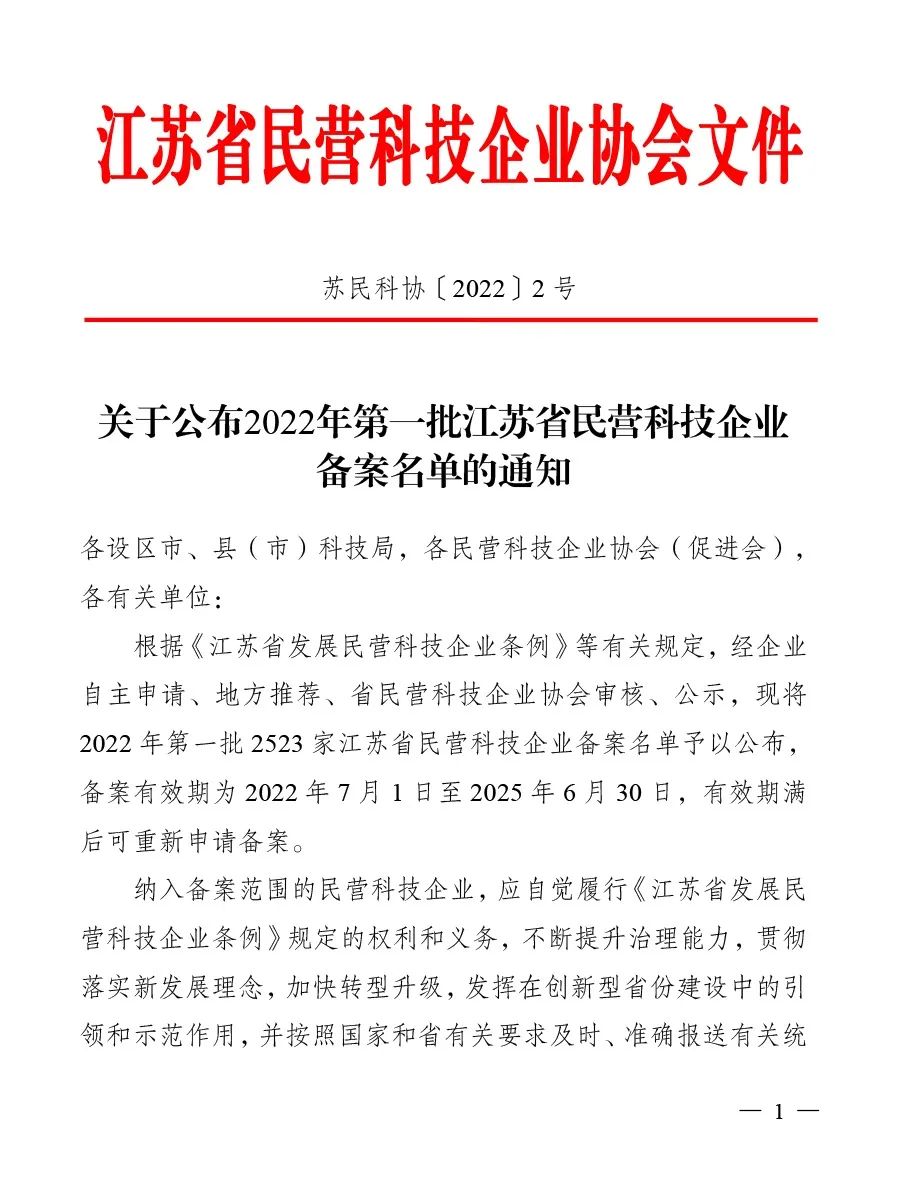 2022年7月,根据《江苏省发展民营科技企业条例》等有关规定,由江苏省民营科技企业协会严格评审、公示,金沙js1005线路(以下简称“百佳年代”)凭借在高分子功能薄膜领域的综合实力和卓越的科研创新能力,成功入选江苏省首批备案企业,被认定为“江苏省民营科技企业”。