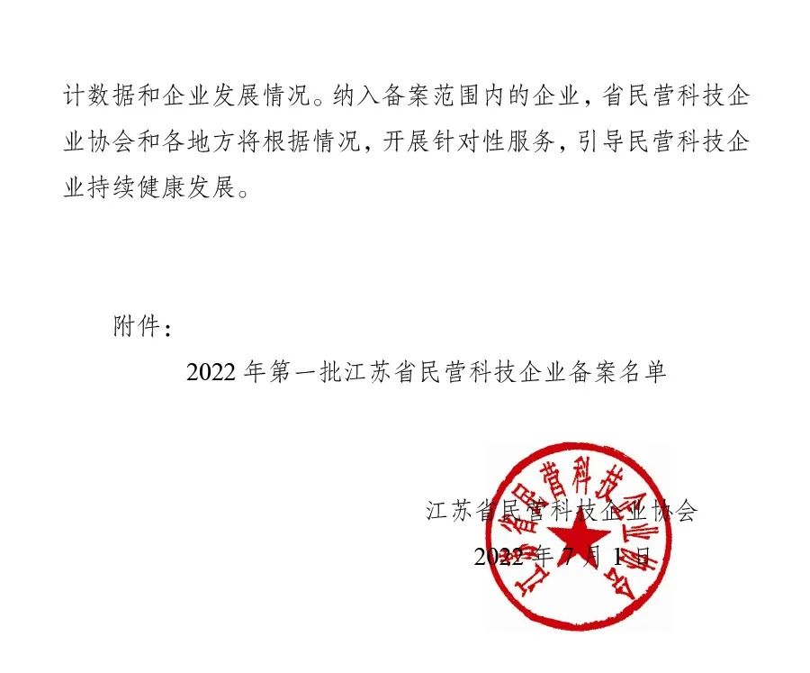 2022年7月,根据《江苏省发展民营科技企业条例》等有关规定,由江苏省民营科技企业协会严格评审、公示,金沙js1005线路(以下简称“百佳年代”)凭借在高分子功能薄膜领域的综合实力和卓越的科研创新能力,成功入选江苏省首批备案企业,被认定为“江苏省民营科技企业”。