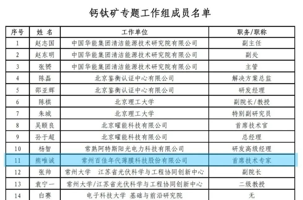会议同期成立了钙钛矿光伏电池标准专题组,该专题组作为我国首个钙钛矿领域标准工作组,由包括华能清能院、国家能源集团、中核电力、华电重工、北京理工大学、常州大学、昆山协鑫、杭州纤纳、隆基绿能等电力、光伏领域优秀企业及权威科研机构、知名高校在内的67位专家代表组成,百佳年代成功入选专题组。作为钙钛矿封装技术的先行者,百佳年代最新推出的高可靠性钙钛矿封装胶膜Billirial®产品,储备多套钙钛矿封装技术解决方案,可满足客户对层压温度等方面的定制化需求,可有效解决钙钛矿电池痛点,该产品得到了海内外CIGS薄膜和钙钛矿组件客户的高度认可,市场需求量攀升。钙钛矿光伏电池标准专题组汇集了业内优质资源,搭建起权威的钙钛矿技术交流平台,未来百佳年代将与专题组优秀同仁携手,积极跟踪调研国内外钙钛矿技术与标准化工作动态,开展钙钛矿光伏电池技术与标准的交流和研讨,积极参与钙钛矿光伏电池标准工作规划和顶层设计,推动钙钛矿光伏电池标准化制定,助力钙钛矿技术与产业化发展。