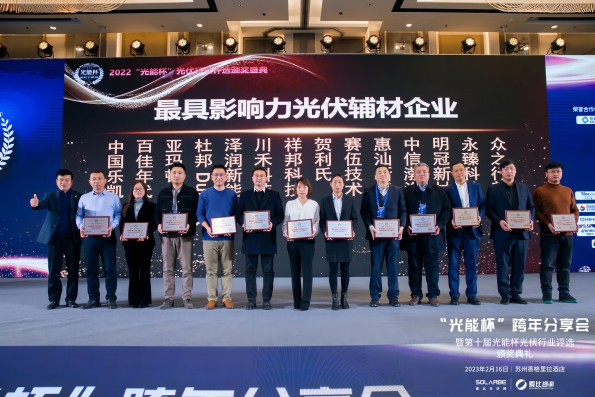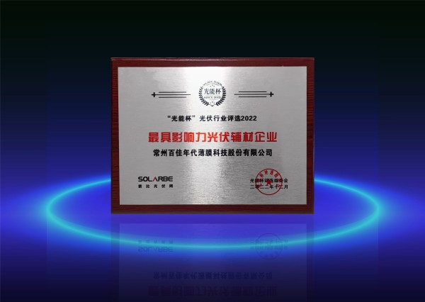 “致敬时代,拥抱变革”,2月16日,由索比光伏网主办的“光能杯”跨年分享会暨2022第十届光伏行业颁奖盛典在苏州盛大召开。百佳年代凭借其在光伏封装胶膜领域的技术研发创新、产业化成果、产品及服务品质等方面的突出贡献,再次获评“最具影响力光伏辅材企业”。