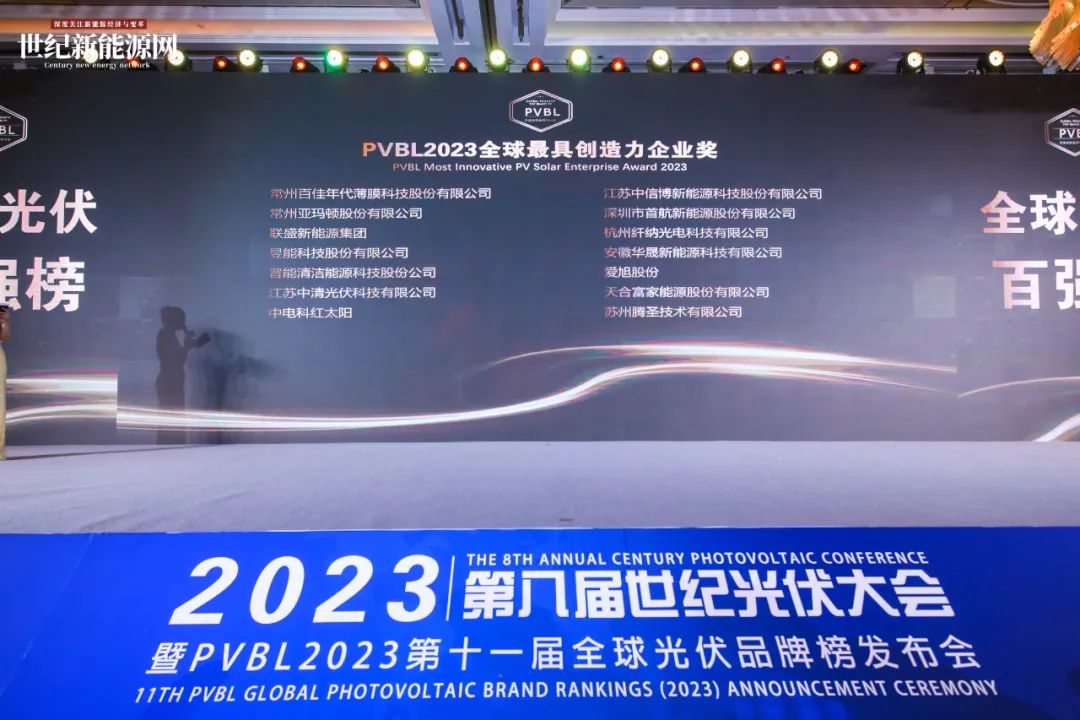 5月22日,由世纪新能源网、光伏品牌实验室(PVBL)联合主办的“CPC2023第八届世纪光伏大会暨PVBL2023第十一届全球光伏品牌榜发布会”在上海盛大举行。百佳年代凭借其在光伏封装领域强大的科研创新实力以及优良的品牌口碑,斩获PVBL 2023“全球光伏最具创造力企业奖”。这是公司继获评PVBL2022“全球光伏最具成长力品牌”之后,连续两届荣登单项奖榜单,充分彰显百佳年代稳健提速的发展态势和持续革新的研发实力。
