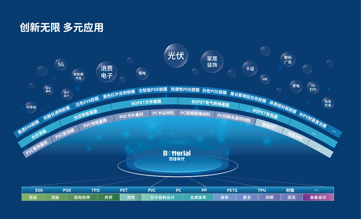 百佳年代发展至今,始终保持战略定力,深度布局新能源产业,聚合多方创新力量成功构建“基膜种类齐全、制造工艺齐备、胶粘剂及涂层材料研发能力突出”的功能性薄膜技术平台。百佳年代紧跟新能源产业技术发展趋势,积极构建新产业格局下高分子功能薄膜产品体系,新能源领域产品品类日趋多元化。
