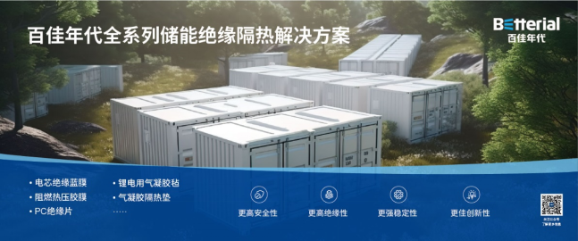 在储能领域,百佳年代也不落人后。针对储能系统的绝缘、隔热难题,推出了电芯绝缘膜、阻燃热压胶膜、PC绝缘材料、气凝胶隔热毡、PIR 隔热缓冲板/片等系列产品,可满足客户不同应用需求的储能绝缘隔热材料解决方案,为储能安全保驾护航。百佳年代创新性推出的气凝胶隔热毡,是一种无机基材(玻纤、陶瓷等)与纳米气凝胶进行超临界复合的绝热材料,具有导热系数小、难燃、轻量化、缓冲防震、使用寿命长、韧性高等特点,引来诸多行业关注。