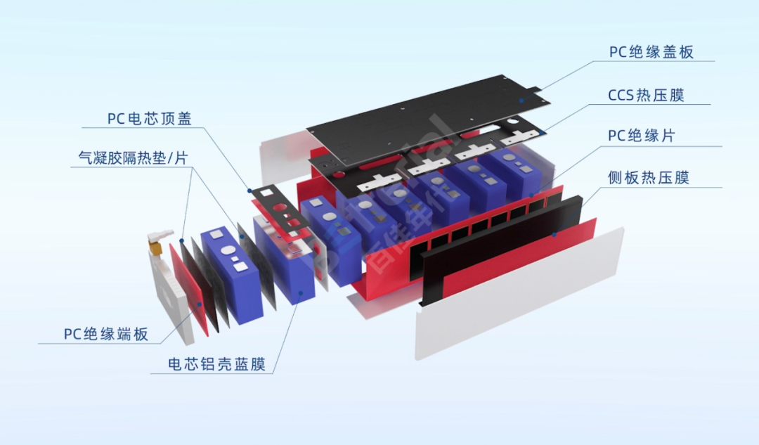 针对储能系统的绝缘、隔热痛点,百佳年代推出了电芯绝缘膜、阻燃热压胶膜、PC绝缘材料、气凝胶隔热毡、PIR 隔热缓冲板/片等系列产品,可满足客户不同应用需求的储能绝缘隔热材料解决方案,为储能安全保驾护航。