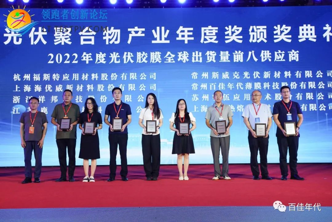 7月27-28日,由上海市太阳能学会、光伏领跑者创新论坛主办,建湖县人民政府承办的“2023 PPIC - 第十届光伏聚合物国际大会”在江苏建湖隆重召开。大会揭晓了“2022年度光伏胶膜全球出货量前八供应商”榜单,百佳年代凭借在光伏胶膜领域领先的技术创新实力、优质的产品服务以及良好的品牌口碑,深受全球客户认可,荣登榜单前四。