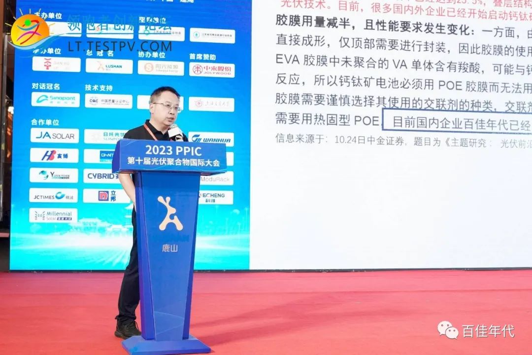百佳年代研发总监熊唯诚博士出席会议,并发表了“高效绿色封装材料的迭代发展”的主题演讲,与业内专家共同探讨高效封装材料的技术发展方向,共同寻求行业创新路线。熊唯诚博士在演讲中指出,作为国内最早涉足光伏封装胶膜领域的企业之一,百佳年代长期致力于光伏封装技术的研发创新,在N型-TOPCon、HJT、钙钛矿等新型高效电池组件封装上均有完善的解决方案。依托百佳年代创新应用平台和新材料研究院等科研力量,可根据客户需求,提供定制封装材料解决方案。