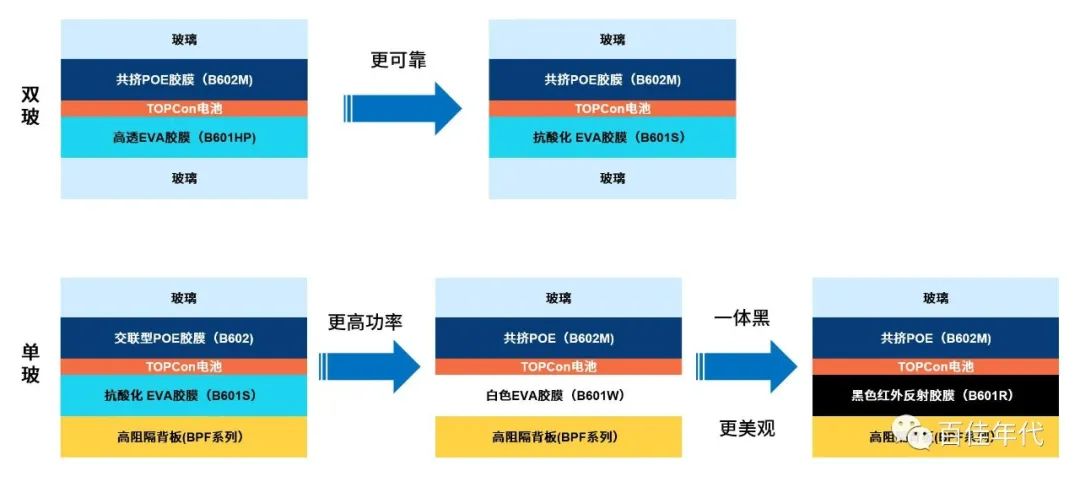 针对TOPCon在抗酸化、耐腐蚀、高阻隔性、高防滑等性能要求的不断提高,百佳年代推出系列应用于TOPCon组件封装解决方案。除满足上述性能需求外,还具有低温塑形,工艺兼容性高,可有效降低电池片的功率衰减等特点,组件功率衰减<3%。