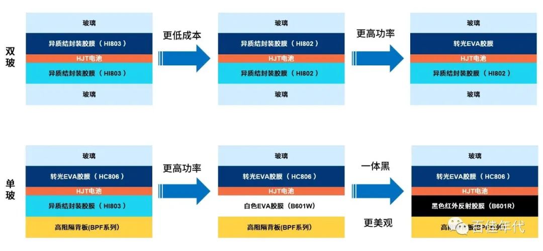 百佳年代推出的异质结组件封装解决方案,采用一体承载技术,可实现0BB封装。一步法完成组件层压复合,可实现层压过程对焊带完美的塑形功能,具有优异的老化后剥离力,可降低银浆及助焊剂用量,可提升组件功率1-2W,助力光伏行业降本增效。