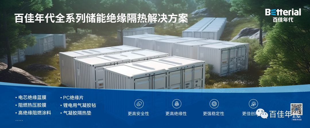 针对储能系统的绝缘、隔热难题,百佳年代推出了应用于储能电池领域的柔性电芯绝缘胶带、绝缘热压膜、PC绝缘阻燃材料、绝缘涂层材料、气凝胶隔热垫/片及定制胶粘剂等产品,可满足市场不同的应用需求。除此之外,百佳年代还拥有齐备的压延、流延、双向拉伸、涂布、复合、模切等材料加工产线,可根据客户需求提供一站式绝缘和隔热材料解决方案。