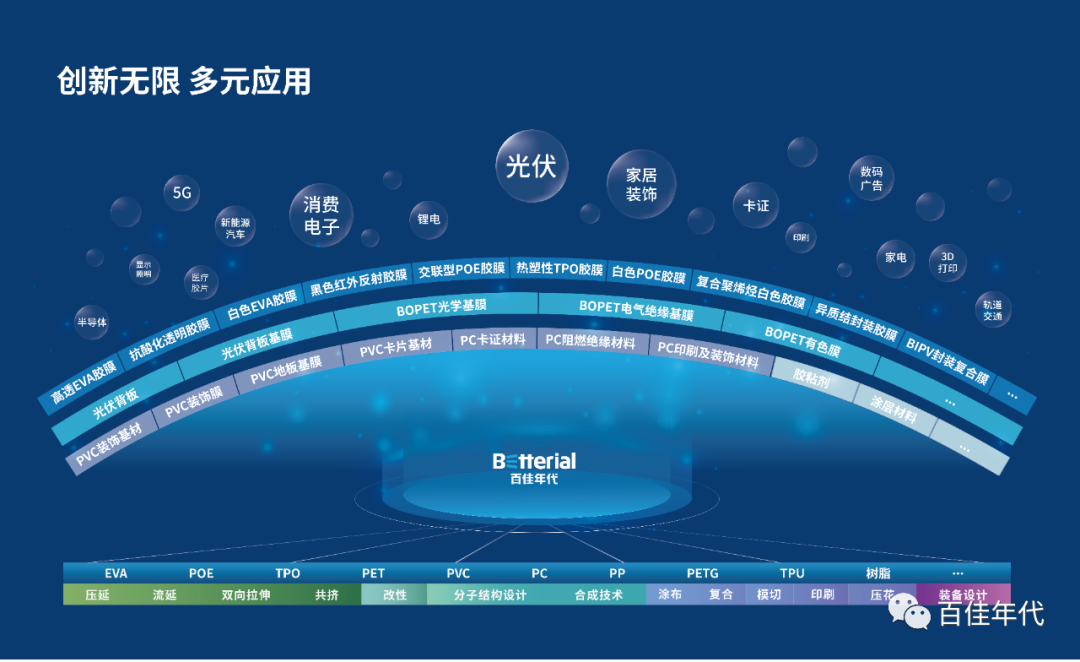 百佳年代在光伏封装胶膜、光伏背板、绝缘材料、隔热材料、涂层材料、定制胶粘剂等关键材料方面可实现自主研发、自行生产,产品品质可控,能够有效降低制造成本。公司设有齐备的流延、压延、挤出、双向拉伸、复合、精密涂布、精密模切、印刷和压花等进口高端精细化产线,形成了一体化制造优势,可以在最短的时间内响应需求、提供方案、专业赋能,最大限度满足客户精益降本要求。