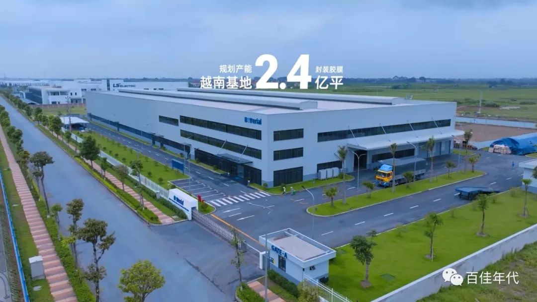在国家“一带一路”政策的倡导下,为进一步强化公司全球发展战略,积极推动与“一带一路”国家的经济互通。百佳年代于2020年率先在越南设厂,成为当地首家投资并量产的光伏胶膜企业,现设有一期、二期两大制造基地,光伏封装胶膜年规划产能约2.4亿平米,也是目前海外产能最大的光伏封装胶膜企业。