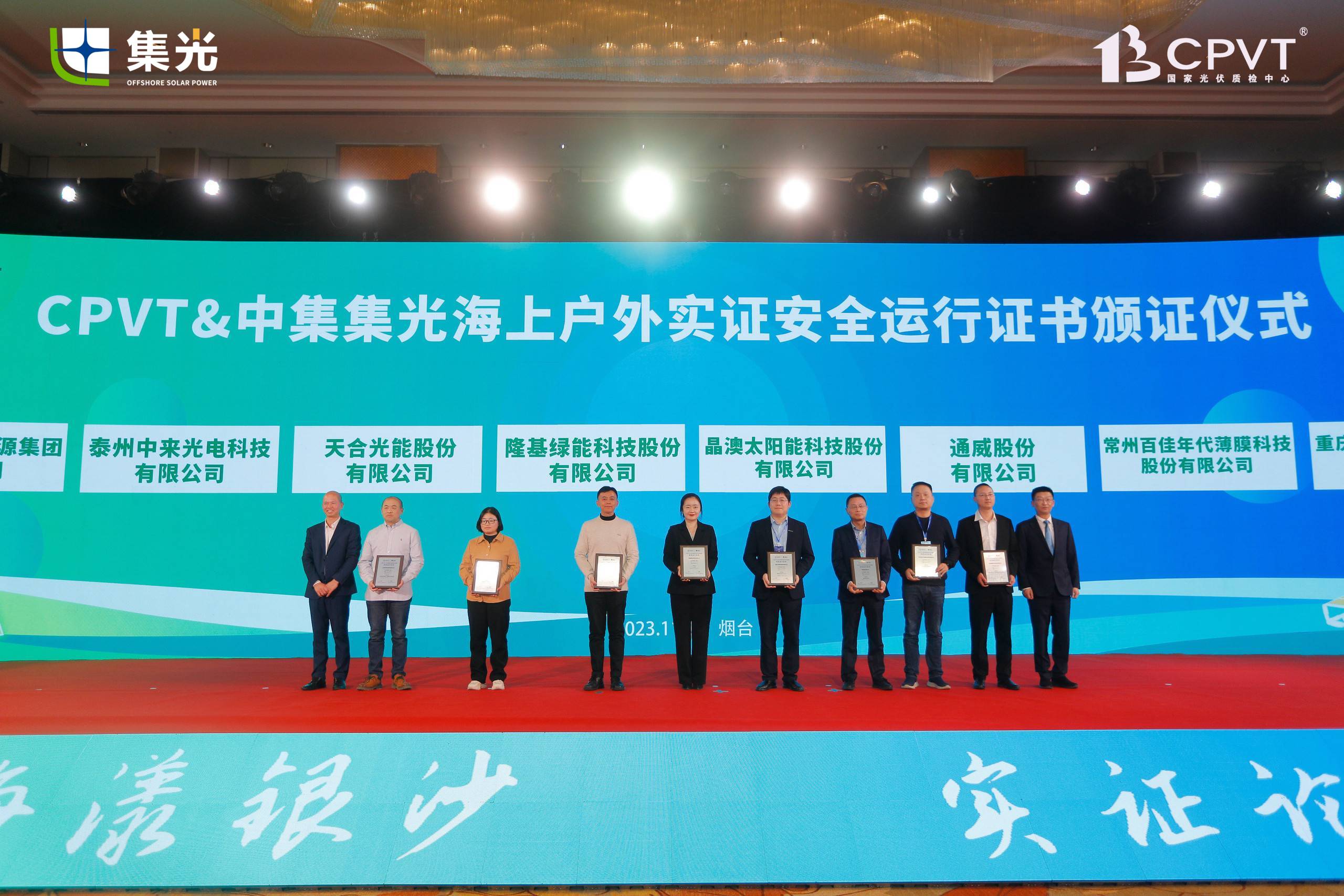 11月21日-22日,“2023年海上光伏系统高质量发展论坛暨CPVT&中集集光共建海上光伏实证基地揭牌启动仪式”在山东烟台隆重举行。百佳年代作为首批入驻CPVT&中集集光海上实证基地的企业受邀出席本次活动,公司推出的海上专用封装解决方案获颁“海上户外实证安全运行证书”,积极助力海上光伏产品可靠性升级!