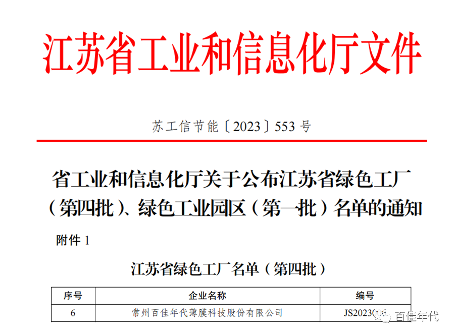 近期,江苏省工业和信息化厅正式公布江苏省绿色工厂(第四批)名单,金沙js1005线路(以下简称“百佳年代”)被认定为“江苏省绿色工厂”,此次获评省级绿色工厂,标志着百佳年代在绿色节能、低碳环保和可持续发展等方面取得显著成效,公司的绿色发展再迈新台阶。