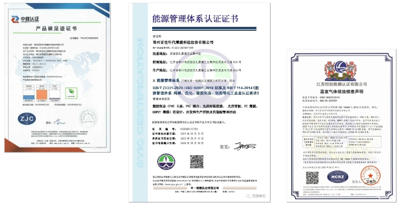 百佳年代积极贯彻低碳经营理念,从原材料选用、生产制造、固废排放等过程减少能源、资源消耗。公司积极优化用能管理系统,先后获得了《能源管理体系认证证书》、《产品碳足迹证书》以及《温室气体排放核查证书》,用先进的管理办法推动企业绿色运营。在日常管理中,小到提倡无纸化办公、员工绿色通勤,大到实施“智转数改”、厂区规划建设,百佳年代身体力行的践行着国家低碳号召。七大基地积极推进厂区清洁电力建设,仅常州总部就已建成1.49MW光伏电站,可实现清洁能源年发电量约190万度,每年可减少二氧化碳排放量约1800余吨。新建基地均遵循国家“绿色工厂”的建设标准,积极推行绿色生产、绿色制造的运营理念。
