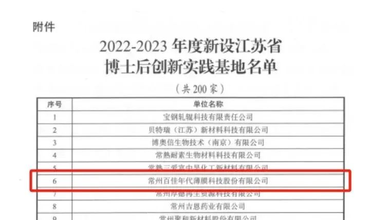 近年来,百佳年代高度重视技术研发和高端人才引进与培养,不断引进专业对口的技术型人才、加强研发与创新投入。公司设有“百佳新材料研究院”、“省级工程技术研究中心”、“光伏产品检测技术联合创新中心”,搭建“高分子功能薄膜创新应用平台”。先后与东南大学、常州大学等知名高校开展产学研合作,积极探索高分子功能薄膜领域前沿技术,提升核心技术竞争力。此次成功获批江苏省博士后创新实践基地,是对百佳年代科研创新平台建设成果的肯定,也是对公司在高层次人才综合培养、高水平科研及产业创新领域取得成绩的认可。