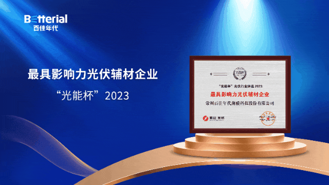 1月10-11日,由索比光伏网、索比咨询联合主办的2023年度跨年分享会暨第十一届“光能杯”光伏行业颁奖盛典在苏州圆满落幕。百佳年代凭借多年来在光伏封装材料以及储能绝缘隔热材料领域的深耕和创新,荣获“最具影响力光伏辅材企业”、“最具影响力光储解决方案企业”以及“2023年中国储能产业新秀 ”,一举摘得三项殊荣,充分彰显企业实力!