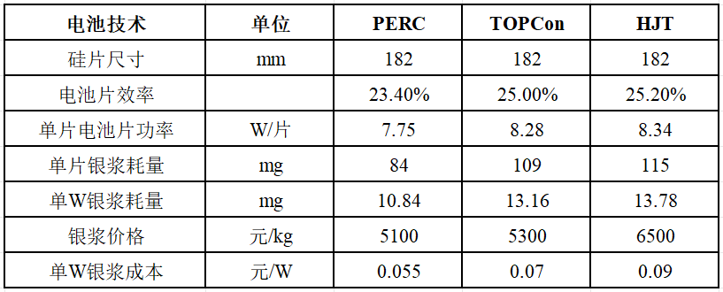 表:不同电池的银浆成本