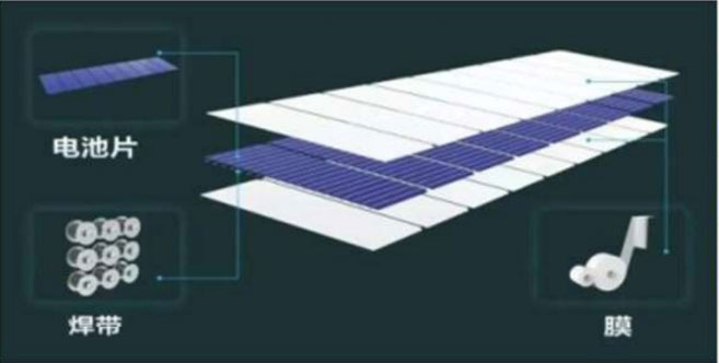 通过一次性直接覆膜把焊带压接在电池片正背面来进行串连接的工艺方式,再通过层压实现焊带与电池片的合金化。如下图所示。