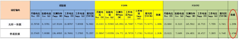表:光转一体膜与普通胶膜的PID试验对比结果