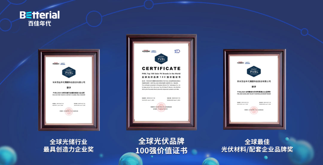 6月11日,由光伏品牌实验室(PVBL)和世纪新能源网发起并主办的第十二届全球光伏品牌榜发布会在上海盛大举行。百佳年代荣登“全球光伏品牌100强”,并一举斩获“全球最佳光伏材料/配套企业品牌奖”“全球光储行业最具创造力企业奖”等多项殊荣。获此殊荣,不仅彰显了企业强大的综合实力,更充分印证了百佳年代在新能源行业中的持续稳健发展及卓越的市场竞争力。