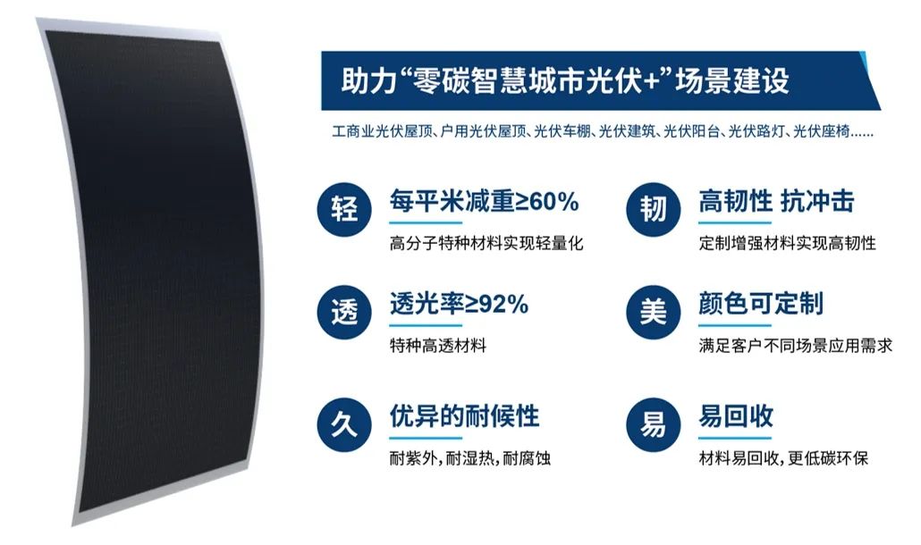2023年以来轻质组件出货量呈GW级规模,未来增长空间巨大。封装材料在轻质组件成本占比约50%,尤其是轻质前板的耐候性、耐冲击性、防隐裂性以及透光性等对轻质组件的使用寿命、转换效率等起到至关重要的作用。但目前轻质前板厂家众多,结构良莠不齐。百佳年代针对这一市场需求,经过长期技术攻关和工艺优化,成功向市场推出【LightUP·轻上】轻质增强前板,该产品采用高分子复合技术,由特种玻纤、树脂、功能助剂交联铆接而成,在抗冲击、耐候、耐磨、耐腐蚀、透光性等方面,均有着亮眼的表现,可以为轻质组件提供完美防护,为构建更多零碳智慧城市场景持续助力。