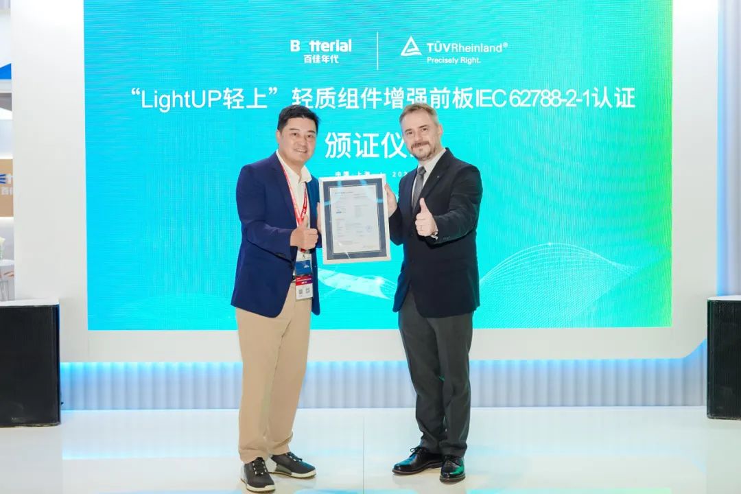 发布会现场还举办了权威机构授证仪式,德国莱茵国际独立的检测、检验和认证机构德国莱茵TÜV大中华区(以下简称“TÜV莱茵”)为百佳年代【LightUP·轻上】轻质增强前板颁发了IEC 62788-2-1认证证书。德国莱茵TÜV亚太区太阳能与商用产品服务副总裁 Vilmos先生,德国莱茵TÜV集团大中华区太阳能与商业产品服务部门经理 赵一欧女士,百佳年代董事长茹正伟先生、研究院院长周旭先生等双方代表出席了此次颁证仪式。
