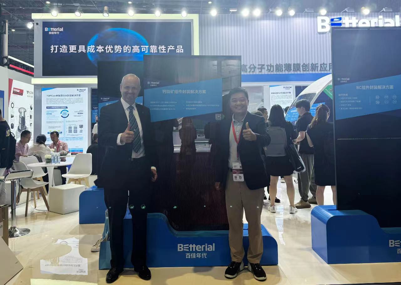 大会期间,百佳年代研究院副院长、首席技术官熊唯诚博士受聘为2024年度中国光伏领跑者创新论坛技术专家委员会成员,并发表了《多场景应用的钙钛矿以及钙钛矿叠层组件封装胶膜的选择》主题演讲。熊唯诚博士在报告中指出,百佳年代新一代钙钛矿专用胶膜采用独特的产品配方,通过聚合接枝和纳米互联等技术,实现了低温快速层压,层间剥离力高,同时解决了极性小分子残留和长期存储性能衰减的问题。该产品对敏感的叠层电池可以起到更好的保护作用,为钙钛矿和叠层钙钛矿组件稳定性提供更多支撑。未来,百佳年代将持续推进新产品、新技术的研发创新,不断优化产品结构,为市场提供更为稳定可靠的产品,助力光伏产业高质量发展。