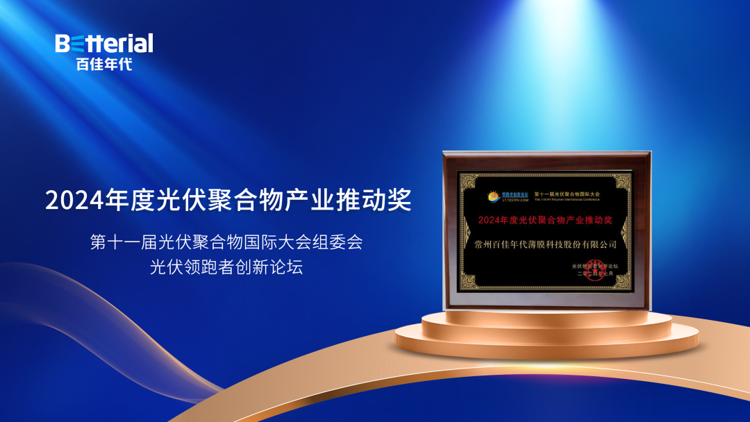 7月11-12日,由上海市太阳能学会、光伏领跑者创新论坛主办的“2024 PPIC - 第十一届光伏聚合物国际大会”在江苏无锡隆重召开。百佳年代凭借在领先的技术实力、优质的产品服务以及良好的品牌声誉,赢得市场认可和信赖,一举斩获“2024年度光伏聚合物产业推动奖”等多项行业大奖。