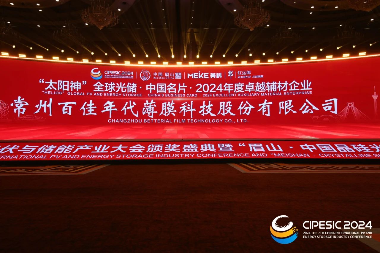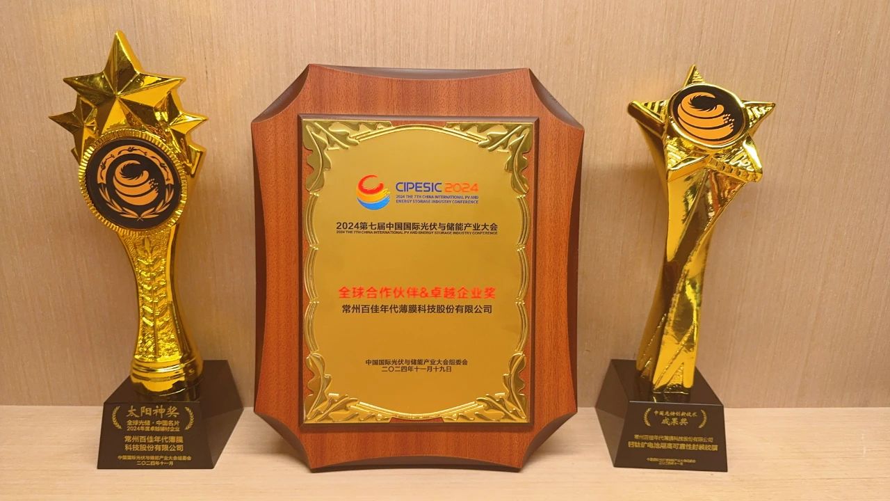 11月18-20日,2024第七届中国国际光伏与储能产业大会在成都世纪城新国际会展中心盛大召开。作为我国西部最重要的国际光储盛会,重要领导、全球光储行业权威专家学者、领军企业家、光储企业代表齐聚一堂,汇智聚力,持续助力世界绿色可持续发展。会上,百佳年代凭借在光伏材料领域领先的创新优势和卓越的市场服务能力,一举揽获“中国光储创新技术成果奖”、“全球光储·中国名片 2024年度卓越辅材企业”、“全球合作伙伴&卓越企业奖”,企业创新实力、行业领先地位和品牌影响力充分彰显。未来,百佳年代将充分发挥自身优势,为以通威为代表的西部地区光伏组件客户提供更加高效、便捷的产品配套服务。