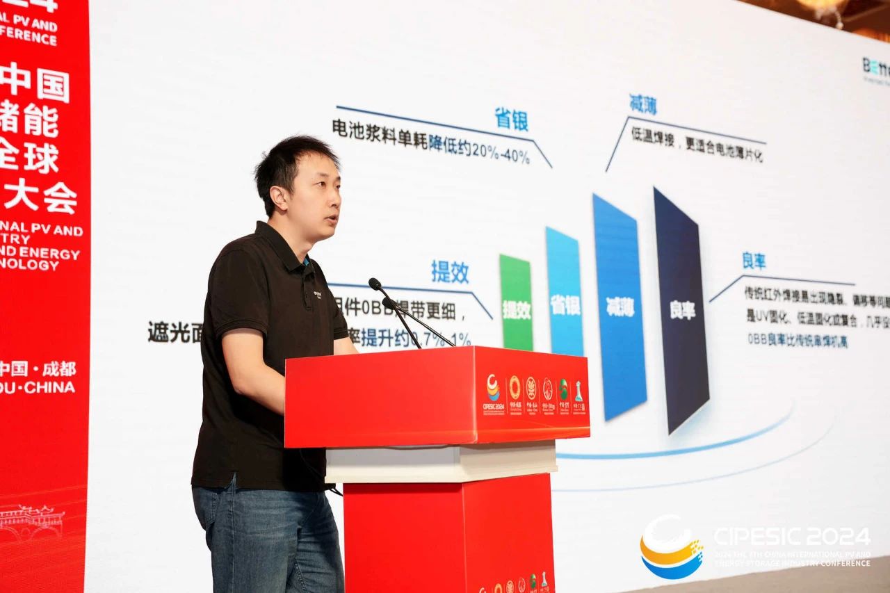 作为本届大会特邀嘉宾,百佳年代受邀发表了《百佳年代无主栅封装技术助力0BB技术量产化进程》的主题演讲,展示了最新的应用于光伏0BB无主栅技术的高可靠性封装解决方案。百佳年代最新开发的应用于0BB组件的“转光一体膜”封装方案,将转光膜与常规胶膜通过共挤工艺实现一次性制备,可将不同波段光吸收转为可见光,进一步提升组件光电转化效率的同时,还兼具了老化剥离力衰减低、紫外稳定性强、制程良率高等特点。经实验室验证,能够明显降低组件的PID效应。百佳年代研发团队将在一体膜技术方向上持续探索,致力于打造更高制程良率和更低生产成本的产品解决方案。