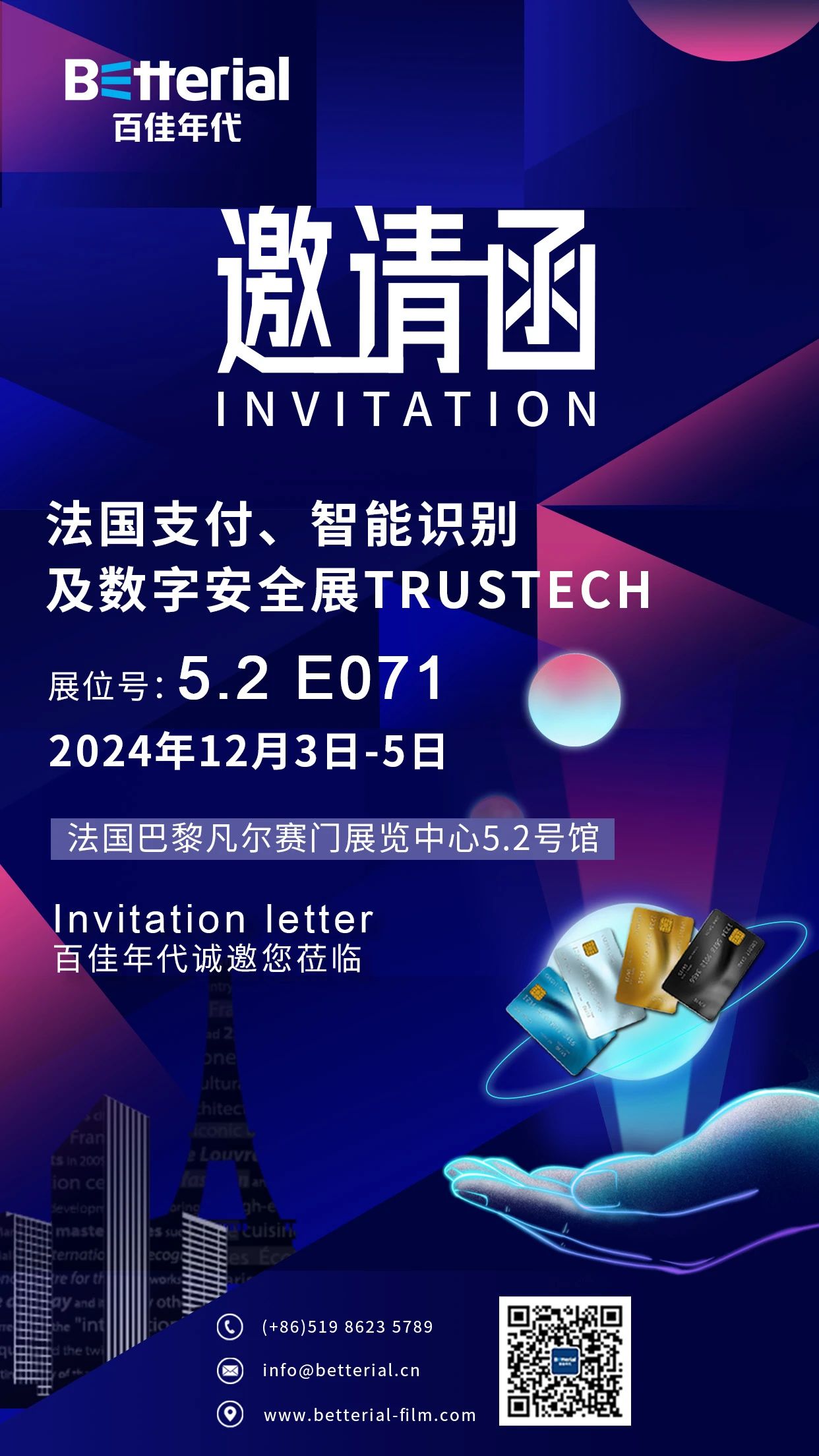 当地时间12月3日,全球最具影响力的法国巴黎智能卡、支付及智能识别、数字安全展览会(Trustech 2024),在法国巴黎凡尔赛门展览中心(Paris Expo Porte de Versailles)正式拉开帷幕。百佳年代作为业内领先的数字支付和智能身份识别系统材料解决方案供应商,携全球首创COE彩基覆白技术、高分子循环卡基材料以及PC高端卡证材料等最新技术亮相Trustech 2024,百佳年代展位号5.2 E071,期待您的莅临!