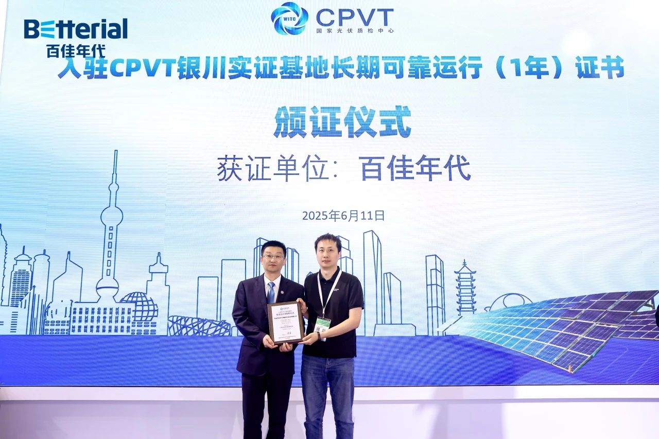 CPVT户外实证运行授证:百佳年代沙漠光伏胶膜完成户外实证安全运行一周年,经中国光伏科学与技术国家实验室(CPVT)验证,其性能稳定且发电效率持续领先。