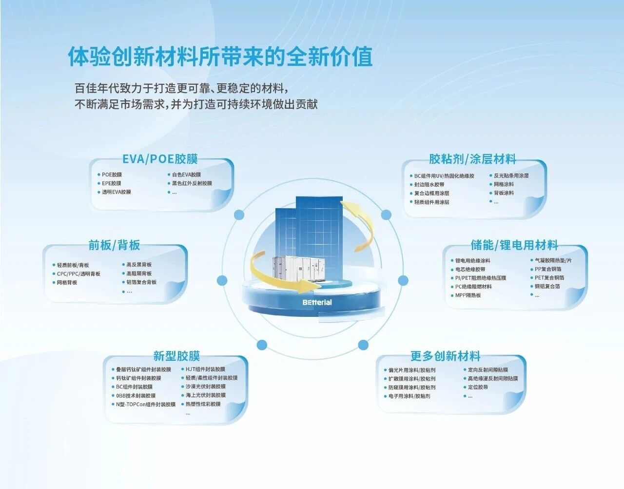 近年来,百佳年代高度重视企业的研发创新,对产品进行了系统化布局和研发,形成了钙钛矿、叠层钙钛矿、BC、0BB、TOPCon、HJT以及轻质组件等全系列封装材料产品矩阵,更推出了沙漠、海洋、冰寒等特殊应用场景的专用胶膜。致力于为全球客户提供更领先、更可靠、更降本的封装材料解决方案。