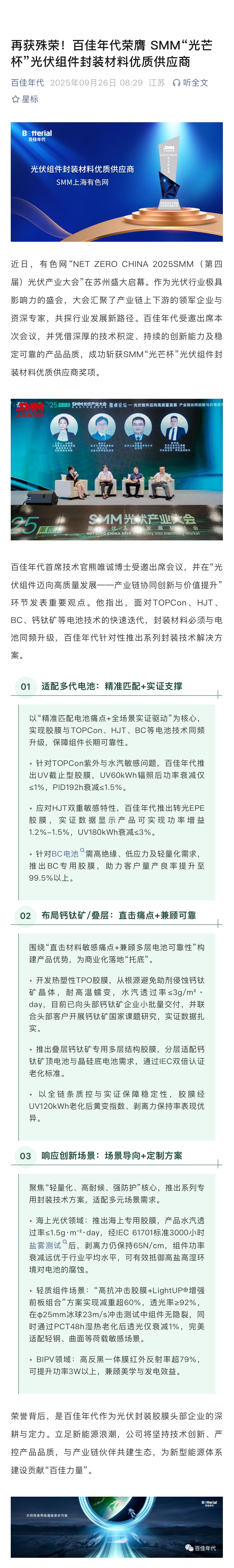 再获殊荣!百佳年代荣膺 SMM“光芒杯”光伏组件封装材料优质供应商_百佳年代_高分子功能薄膜创新应用引领者-金沙js1005线路