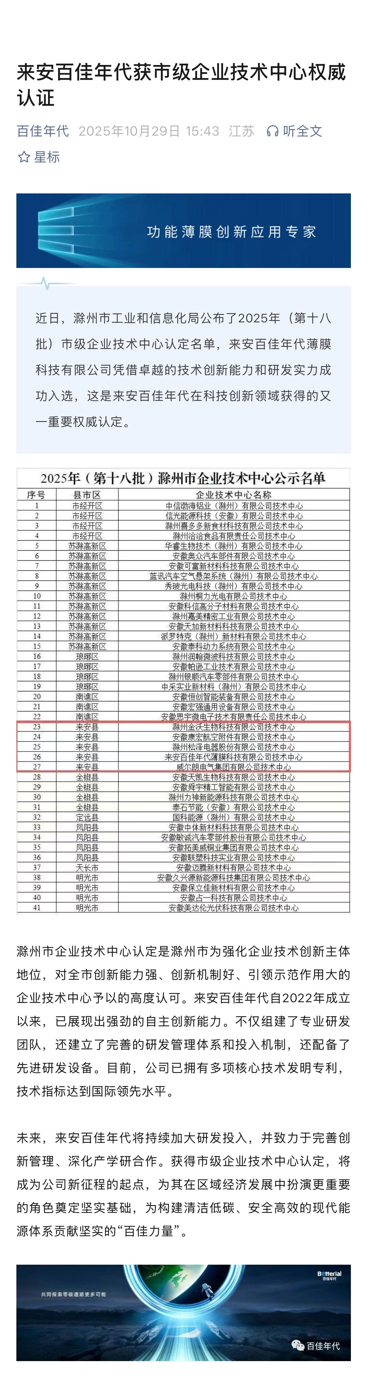 来安百佳年代获市级企业技术中心权威认证_百佳年代_高分子功能薄膜创新应用引领者-金沙js1005线路