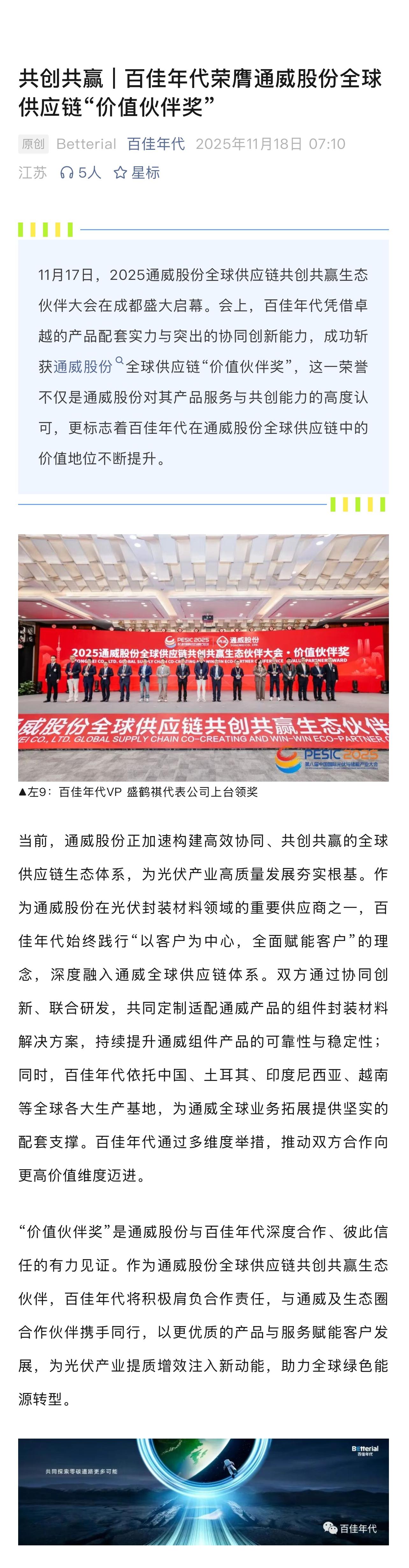 共创共赢 | 百佳年代荣膺通威股份全球供应链“价值伙伴奖”_百佳年代_高分子功能薄膜创新应用引领者-金沙js1005线路