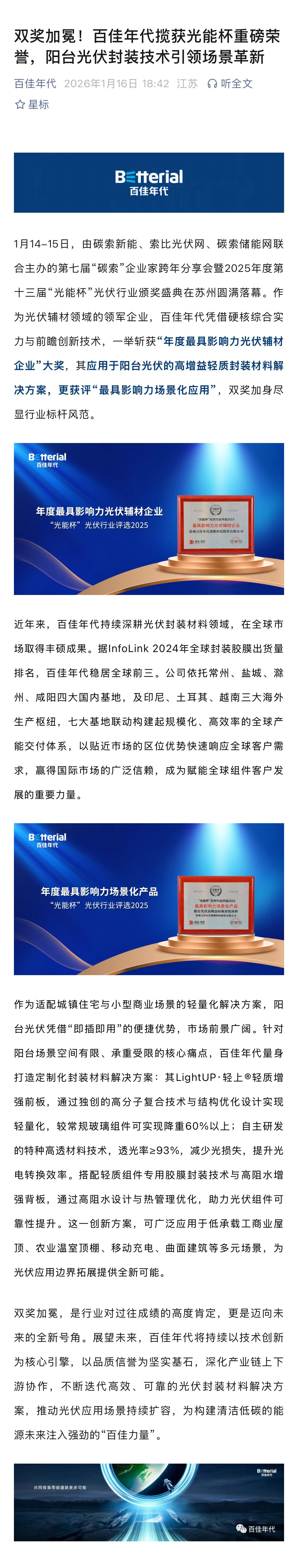 双奖加冕!百佳年代揽获光能杯重磅荣誉,阳台光伏封装技术引领场景革新_百佳年代_高分子功能薄膜创新应用引领者-金沙js1005线路