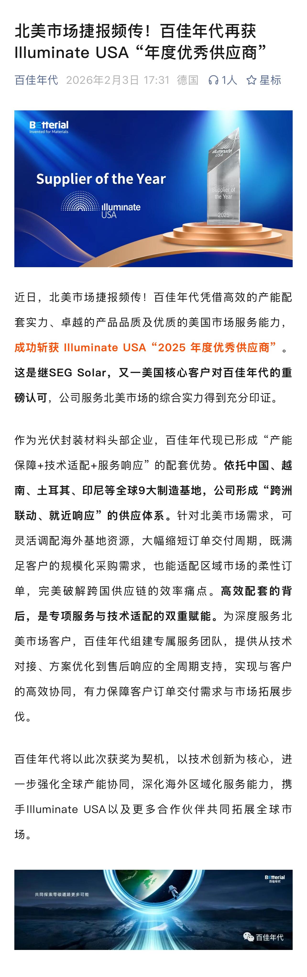 北美市场捷报频传!百佳年代再获 Illuminate USA “年度优秀供应商”_百佳年代_高分子功能薄膜创新应用引领者-金沙js1005线路