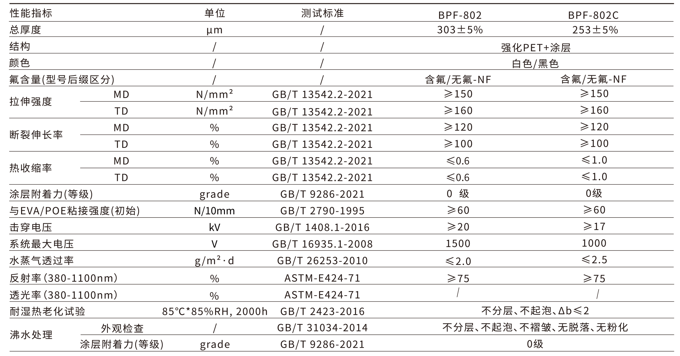 BPF-802是百佳年代最新研发的涂覆型系列光伏背板具有两层结构,以共挤强化PET膜作为外层,以耐候型的氟树脂为连结层。