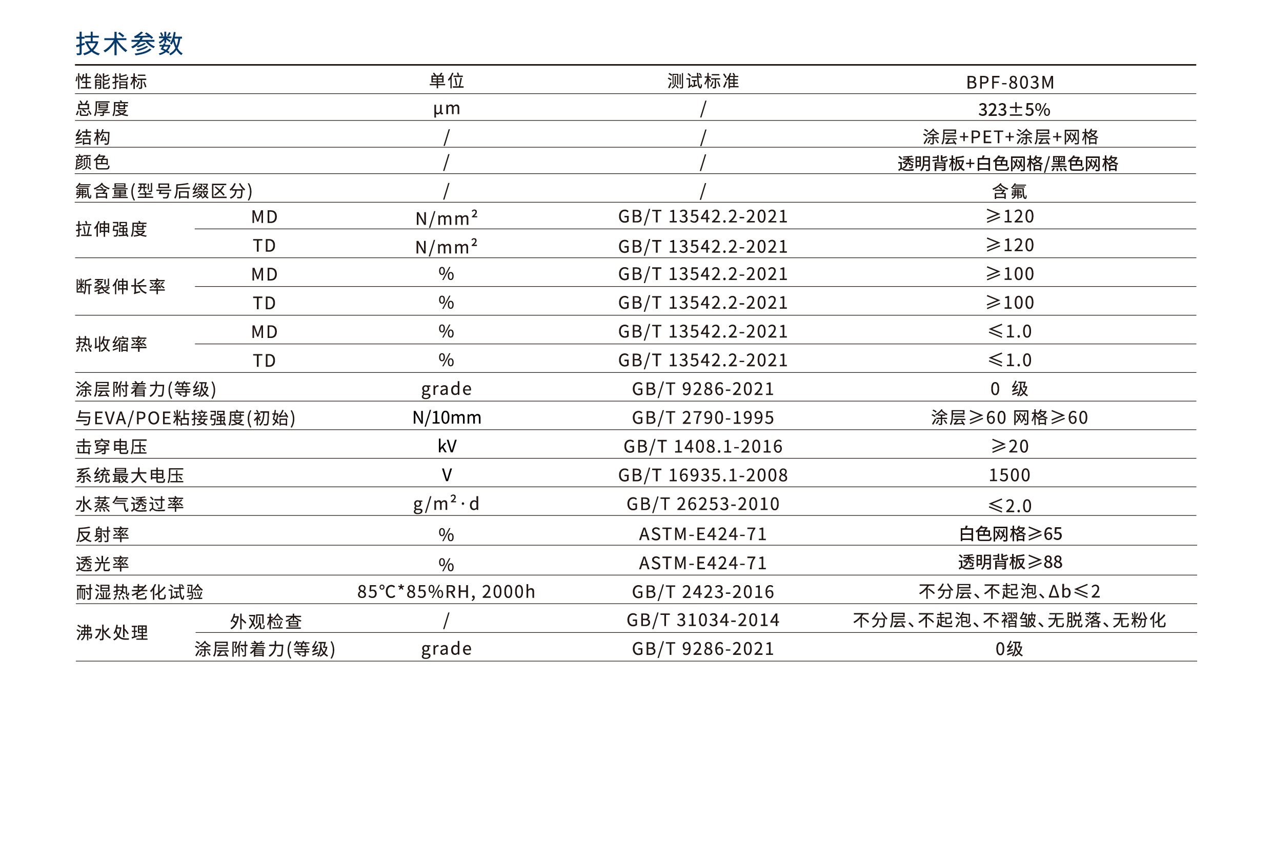 BPF-803M是百佳年代最新研发的涂覆型系列光伏网格背板,在透明CPC结构背板的表面,再印刷特定结构的黑色/白色网格,可以有效提高光伏组件的发电效率。