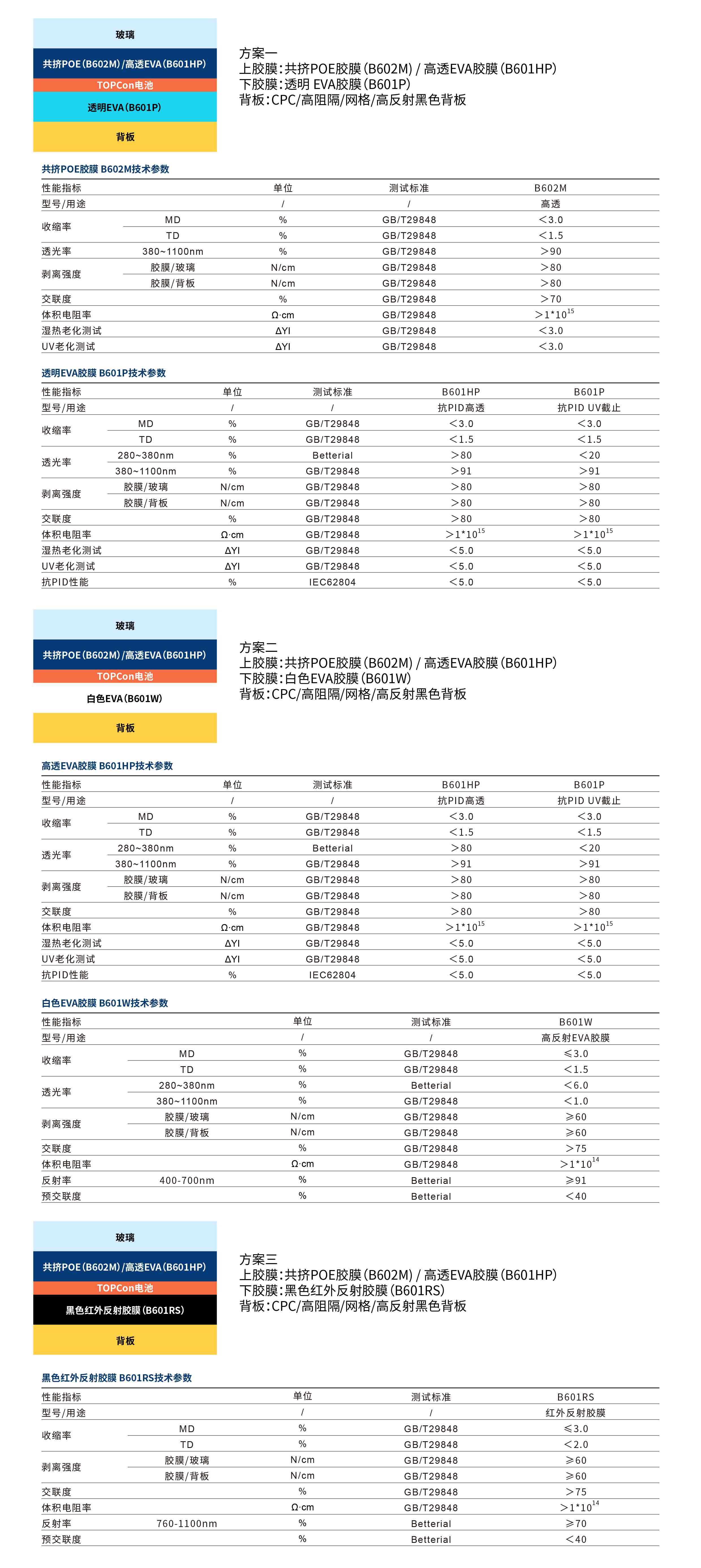 ▶下胶膜:透明EVA(B601P)/白色EVA(B601W)/黑色红外反射胶膜(B601RS)